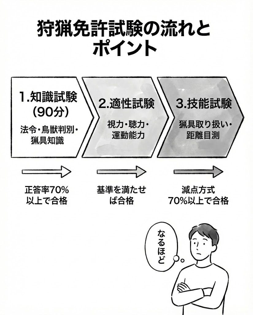技能試験では狩猟鳥獣の判別や猟具の設置などの実技が求められハードルが高めですが、その前段階の知識試験は机上学習でしっかり対策すれば十分にクリアできるはずです。